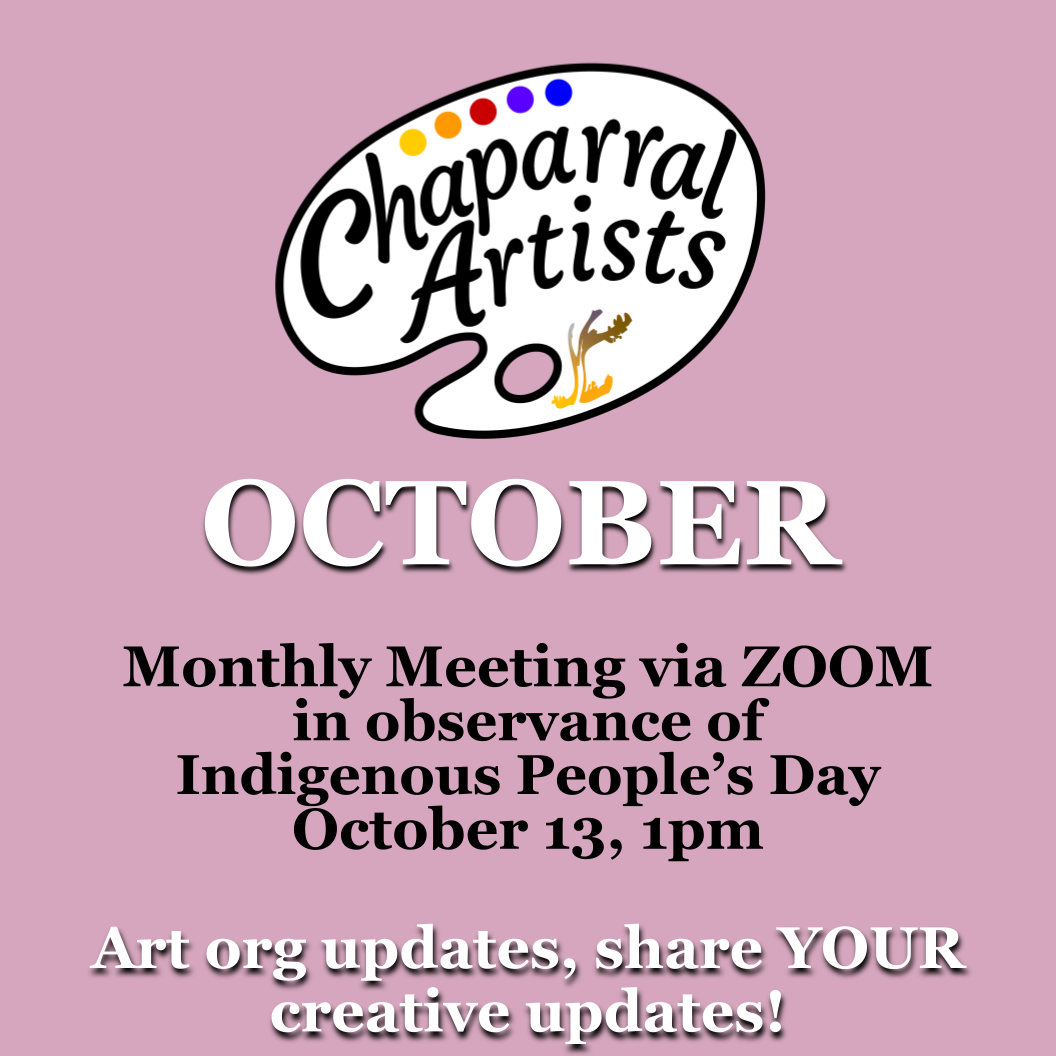 Settle in at home, catch up with what your art organization is putting together over the next few months, and share some creative updates with us that we will be happy to announce on the newsletter, socials, and website. ALL visitors interested in finding out more about the group are welcome to attend any of our general and quarterly meetings! PLEASE contact us at ChaparralArtists@gmail.com for Zoom information – this invite already went out to the membership, visitor will need to request the link 🙂Our NEXT Chaparral Outing