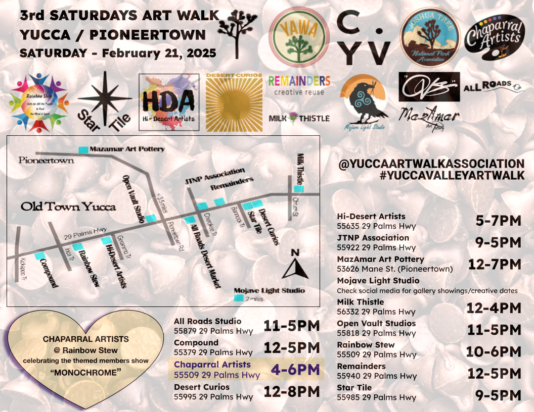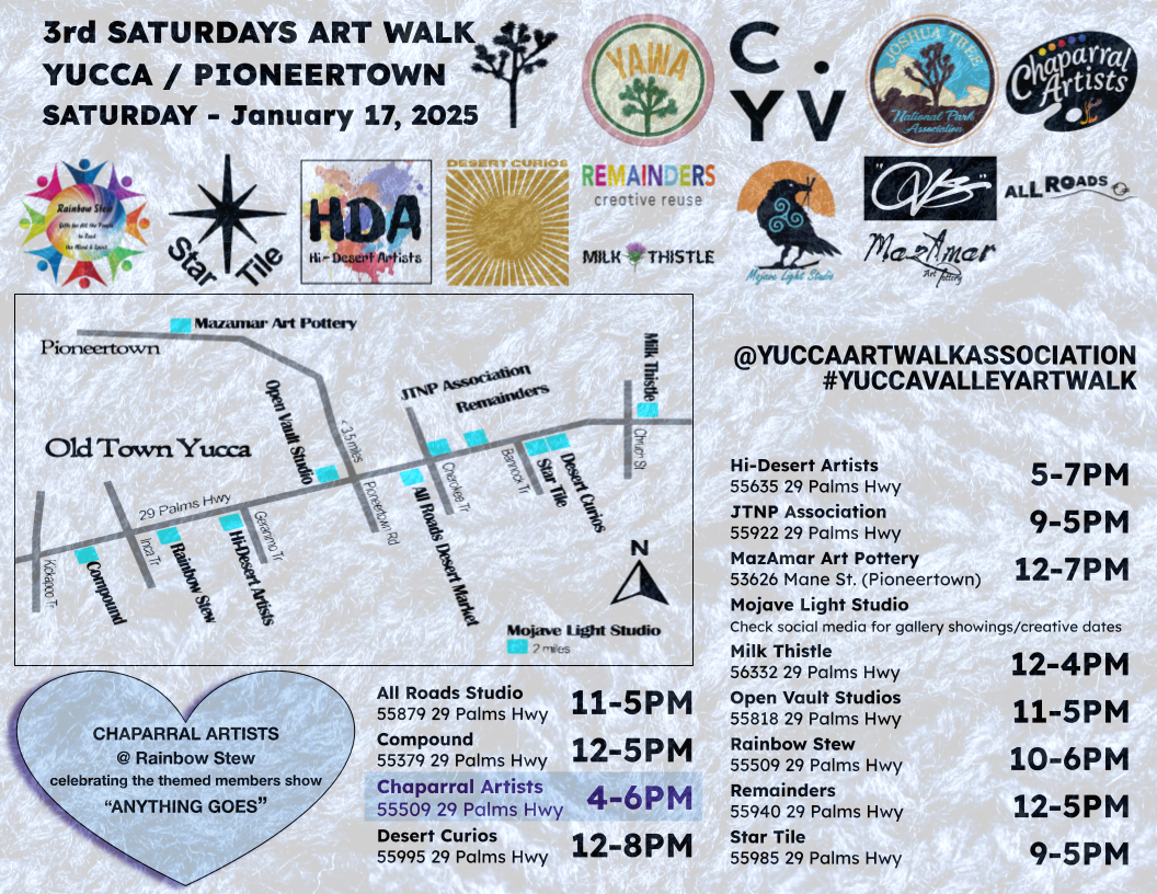 We are an art organization in the Morongo Basin that exists to support artists. Chaparral Artists started as a group of friends that wanted to assist the local theater, later separating into the Chaparral Artists organization. In 2013 we were granted 501(c)3 status with a strong goal of supporting art culture and providing youth art opportunities in the area.