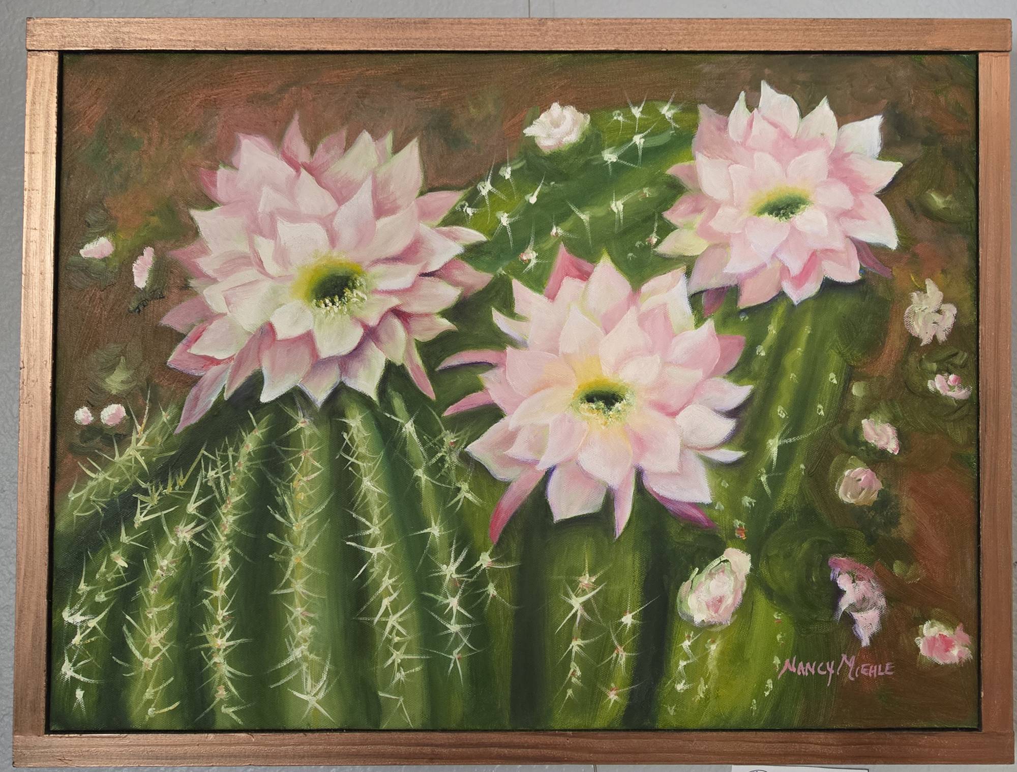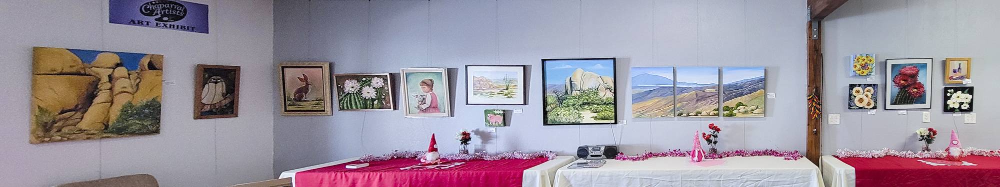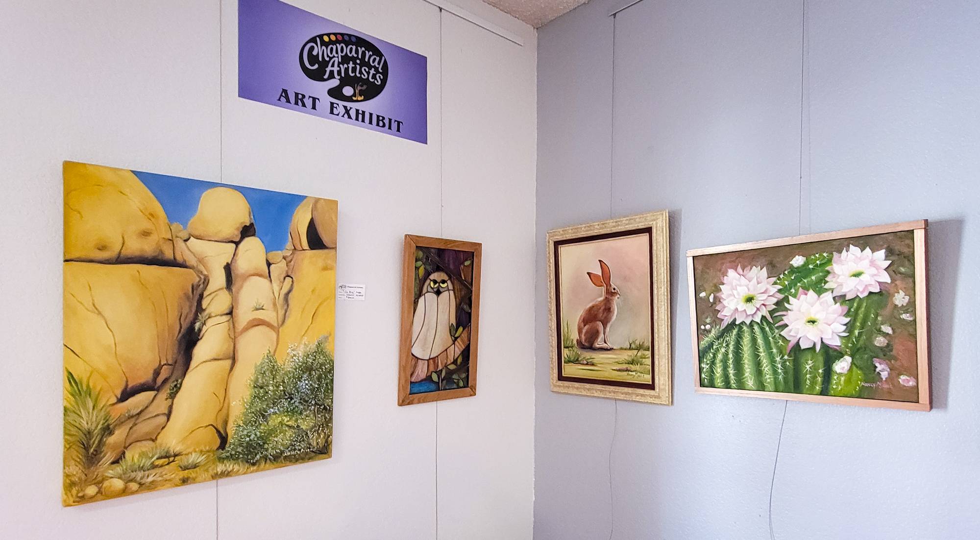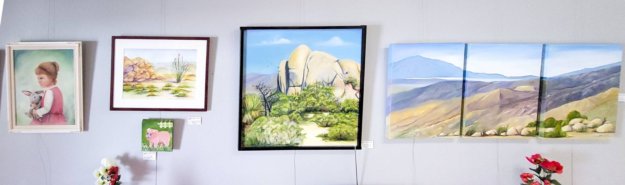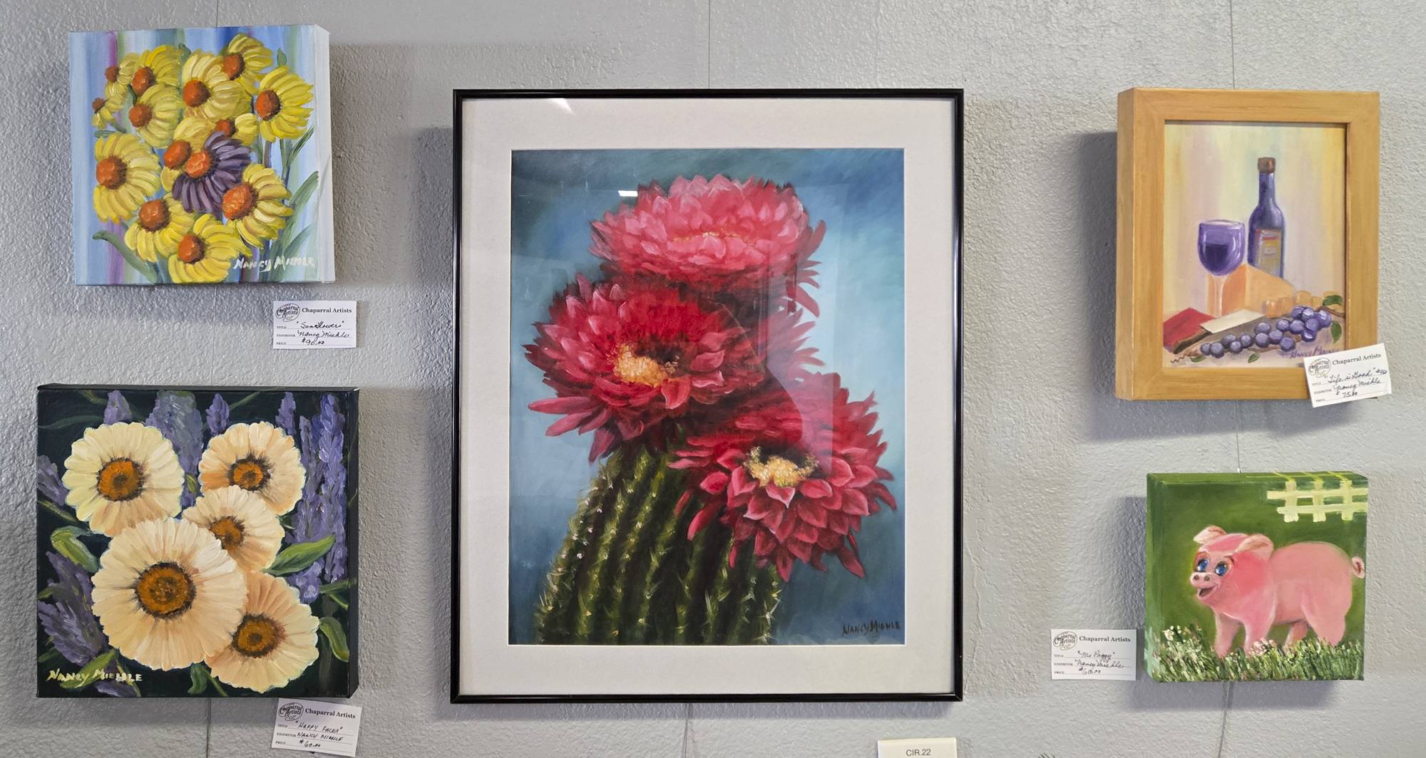 Chaparral member Nancy Miehle offered a wonderful glimpse into her creative world during January 2025. While she enjoys working in a variety of mediums, her passion shines most in oils and stained glass. For this showcase, Nancy presented a beautiful range of works, from expansive desert landscapes in oil to delicate stained-glass creations, and even a gentle watercolor piece.