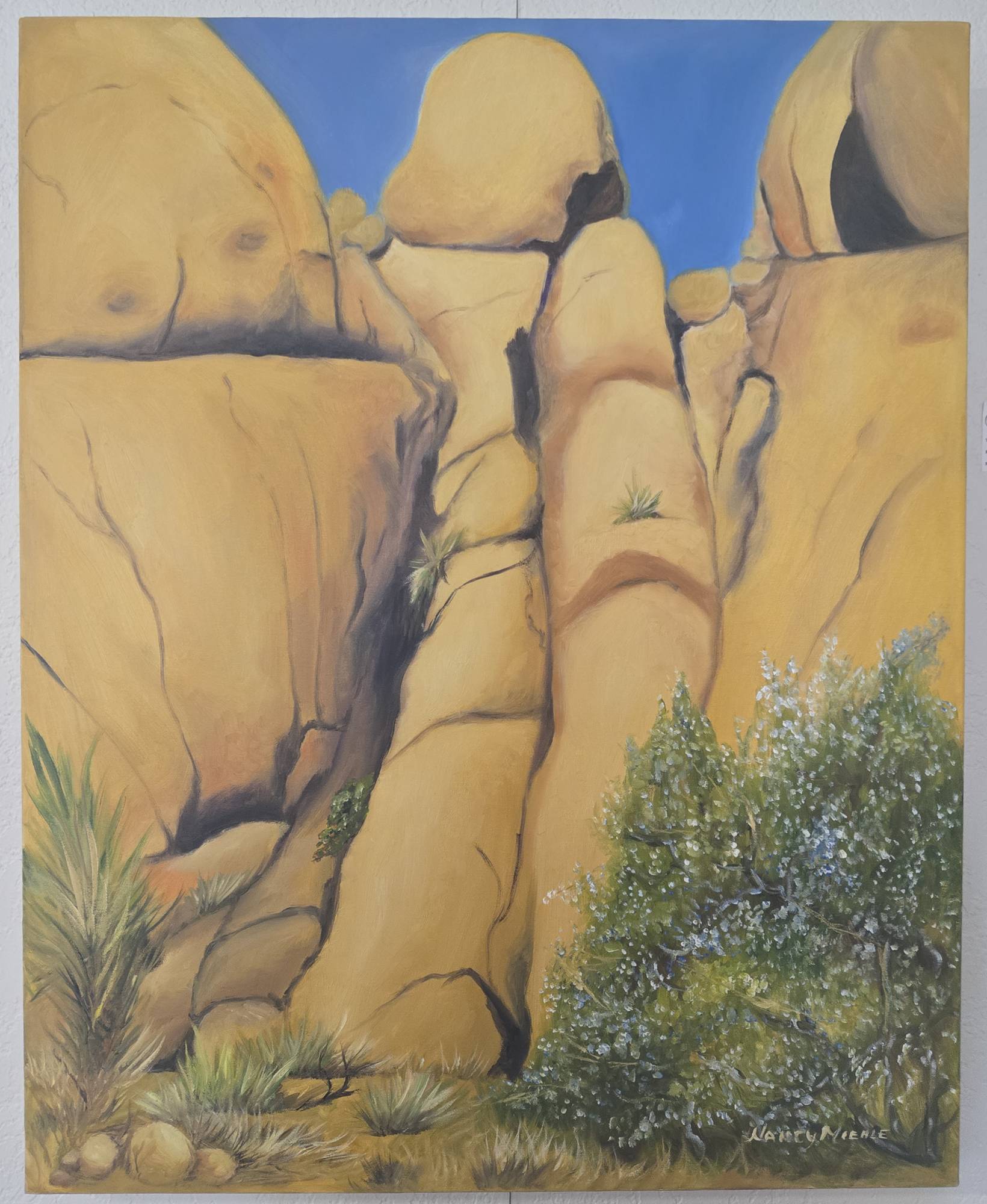 Nancy’s art radiates warmth and friendliness, inviting viewers to step outdoors and experience the serenity she captures so well. With her soft touch and thoughtful eye, she transforms familiar desert scenes into approachable, idyllic visions, where even the massive boulders seem welcoming. Her creatures—both wild and domestic—come alive with bright, expressive eyes that convey curiosity and kindness.